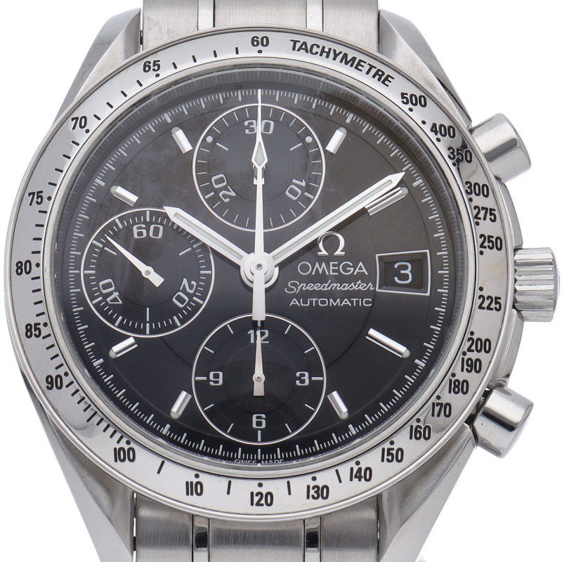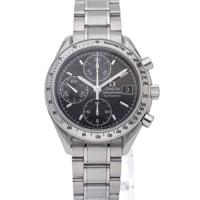 オメガの代表的な人気シリーズ「スピードマスターデイト」。クロノグラフ・デイト表示機能付きと便利で実用性のある1本です。