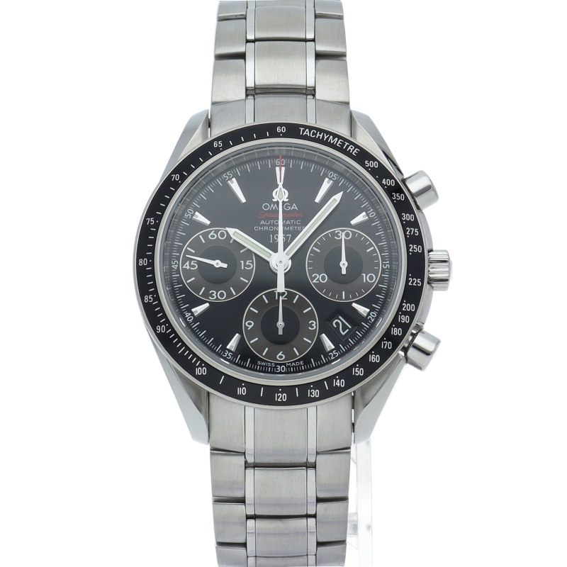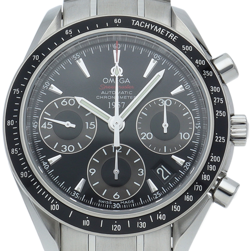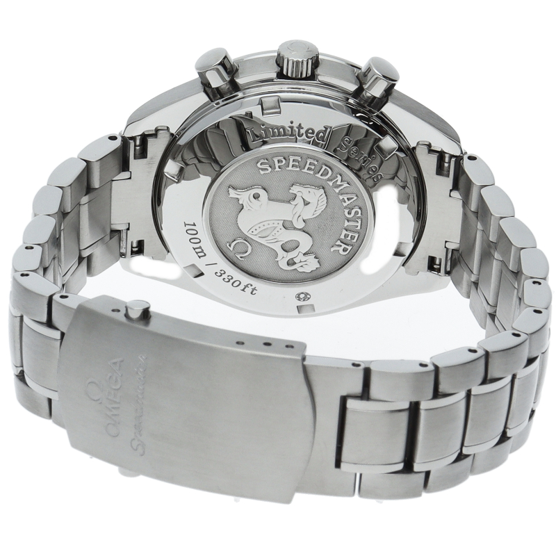 2009年に発売された日本限定モデルです。横三つ目のインダイヤル、4-5時位置に配置されたカレンダー、スピードマスター誕生の年である“1957”が表記されるなど、限定モデルらしいデザインです。