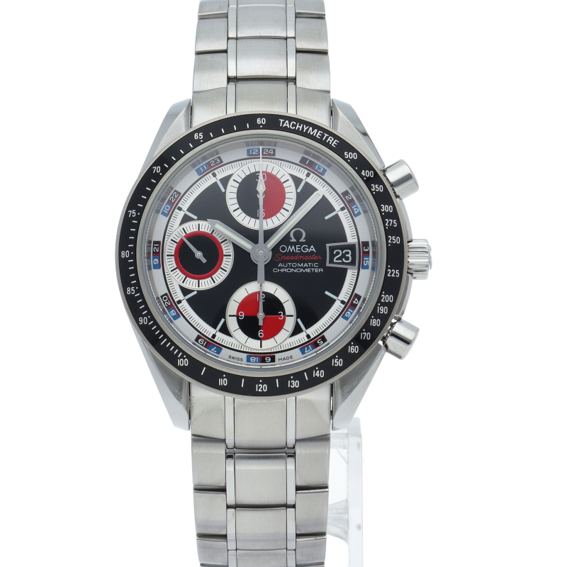 オメガの代表的な人気シリーズ「スピードマスター デイト」。クロノグラフ・デイト表示機能付きと便利で実用性のある1本です。カラフルな文字盤色が、まわりと少し差を付けたい方にうってつけの1本です。