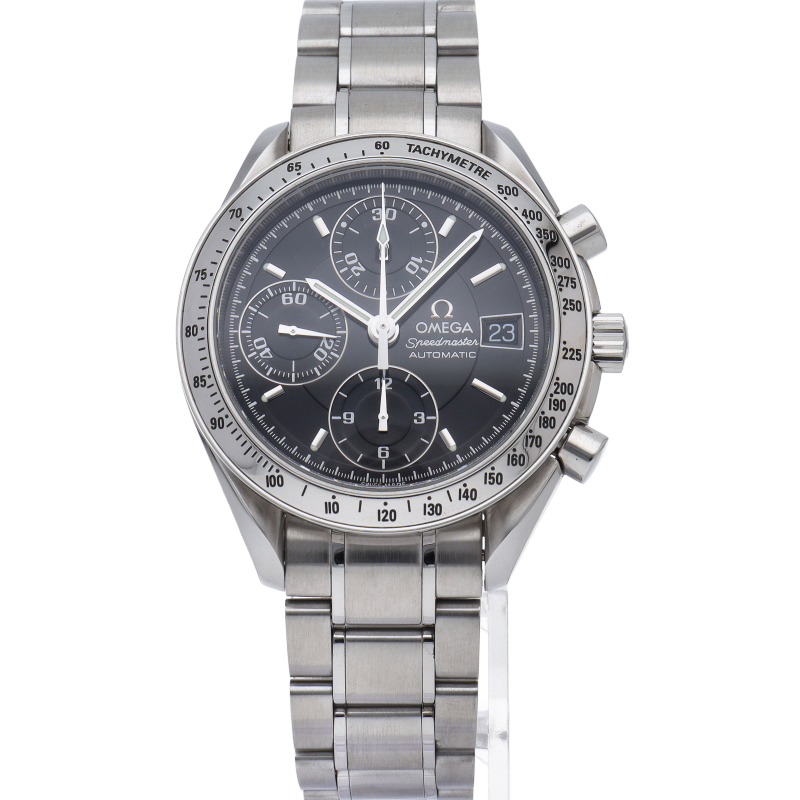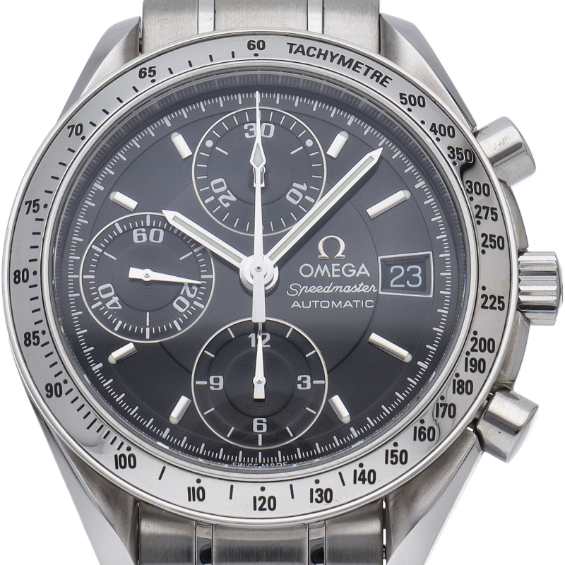 オメガの代表的な人気シリーズ「スピードマスターデイト」。クロノグラフ・デイト表示機能付きと便利で実用性のある1本です。