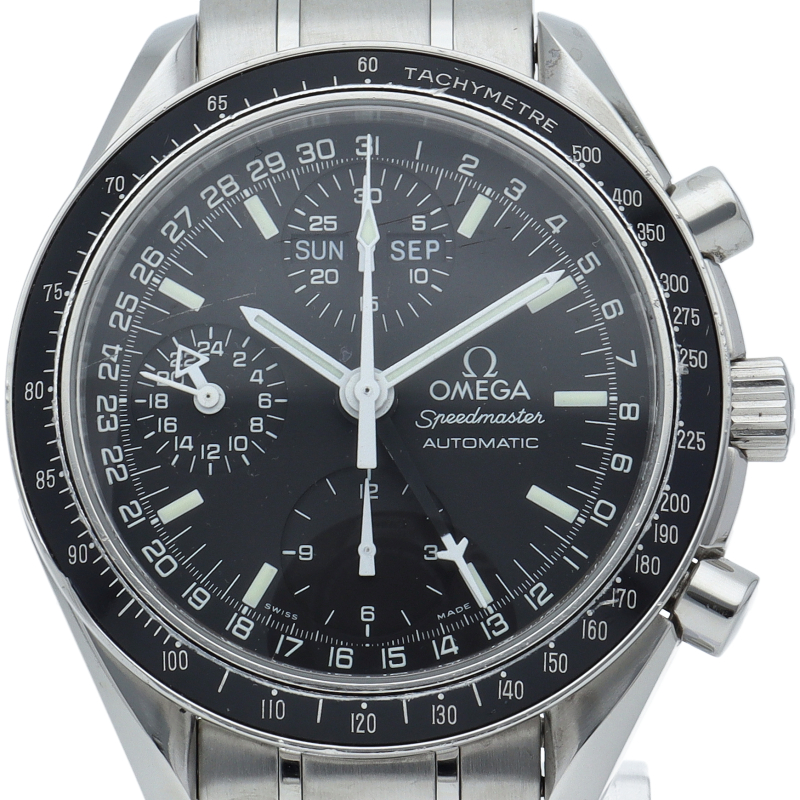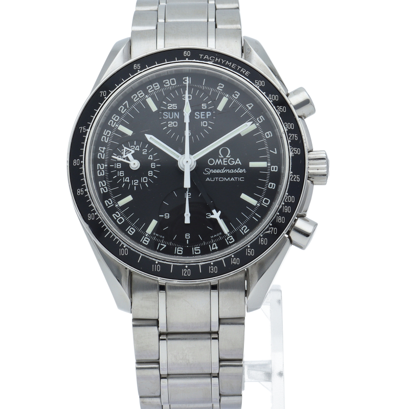 オメガの代表的な人気シリーズ「スピードマスターデイト」。クロノグラフ・デイト表示機能付きと便利で実用性のある1本です。