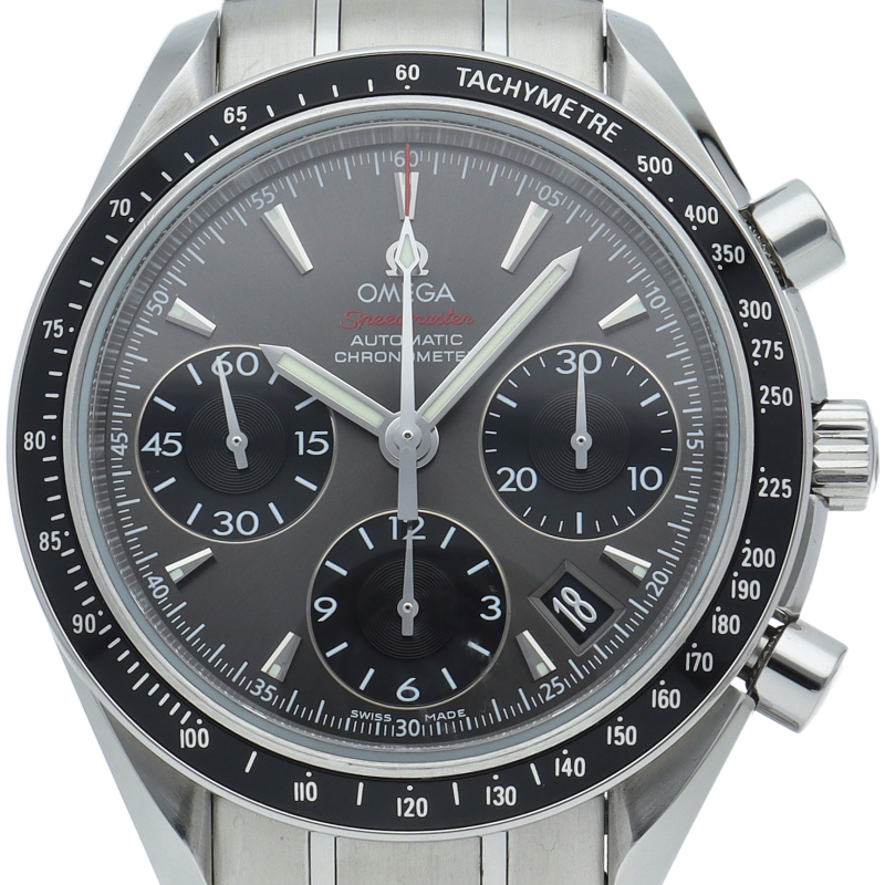 オメガの人気シリーズ「スピードマスター デイト」のクロノメーター規格をパスしたモデル。実用性とデザイン性を兼ね備えた人気の1本。