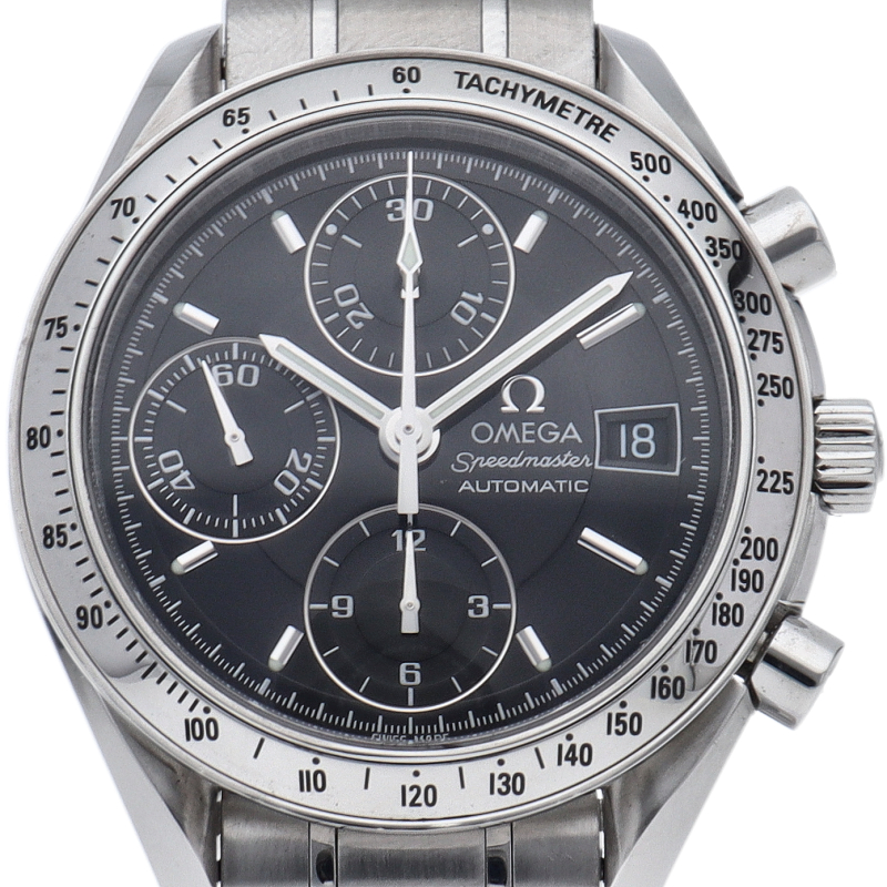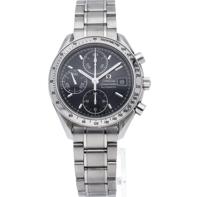 オメガの代表的な人気シリーズ「スピードマスターデイト」。クロノグラフ・デイト表示機能付きと便利で実用性のある1本です。
