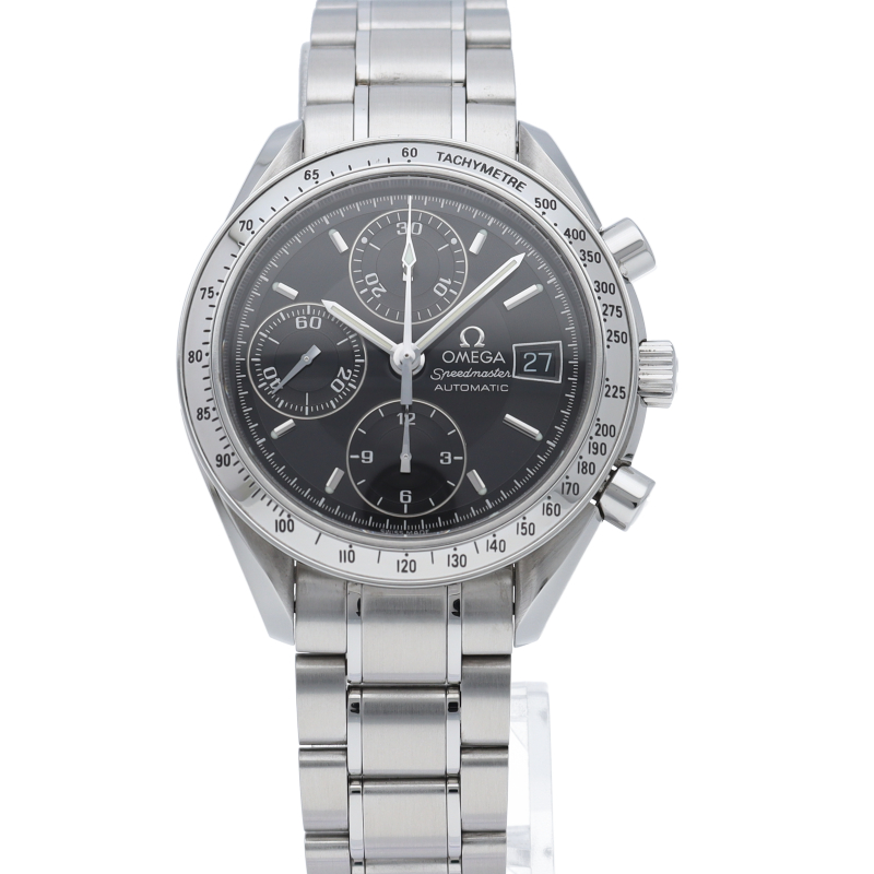 オメガの代表的な人気シリーズ「スピードマスターデイト」。クロノグラフ・デイト表示機能付きと便利で実用性のある1本です。