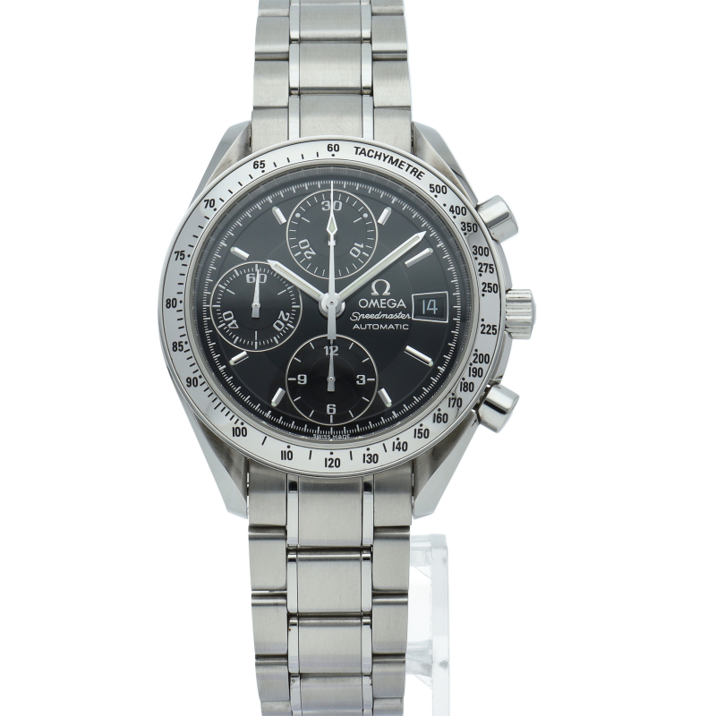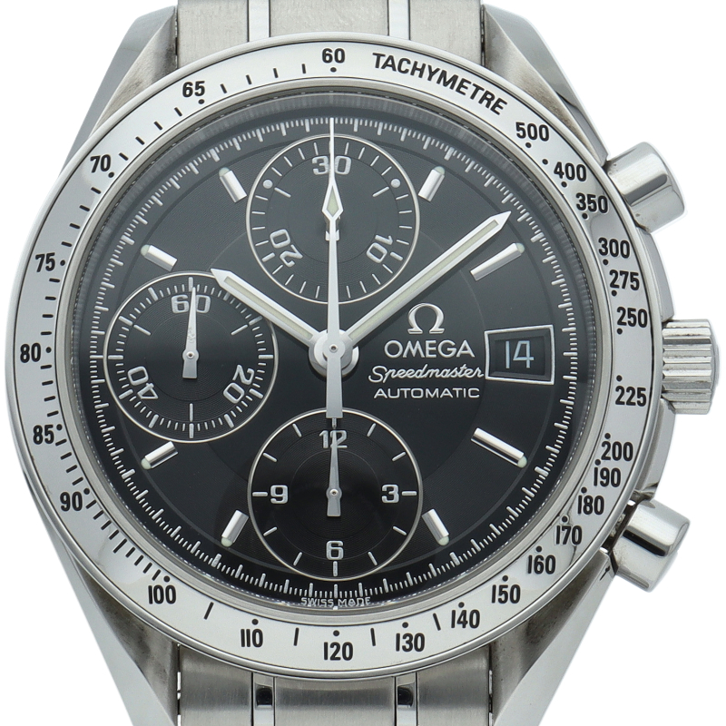 オメガの代表的な人気シリーズ「スピードマスターデイト」。クロノグラフ・デイト表示機能付きと便利で実用性のある1本です。