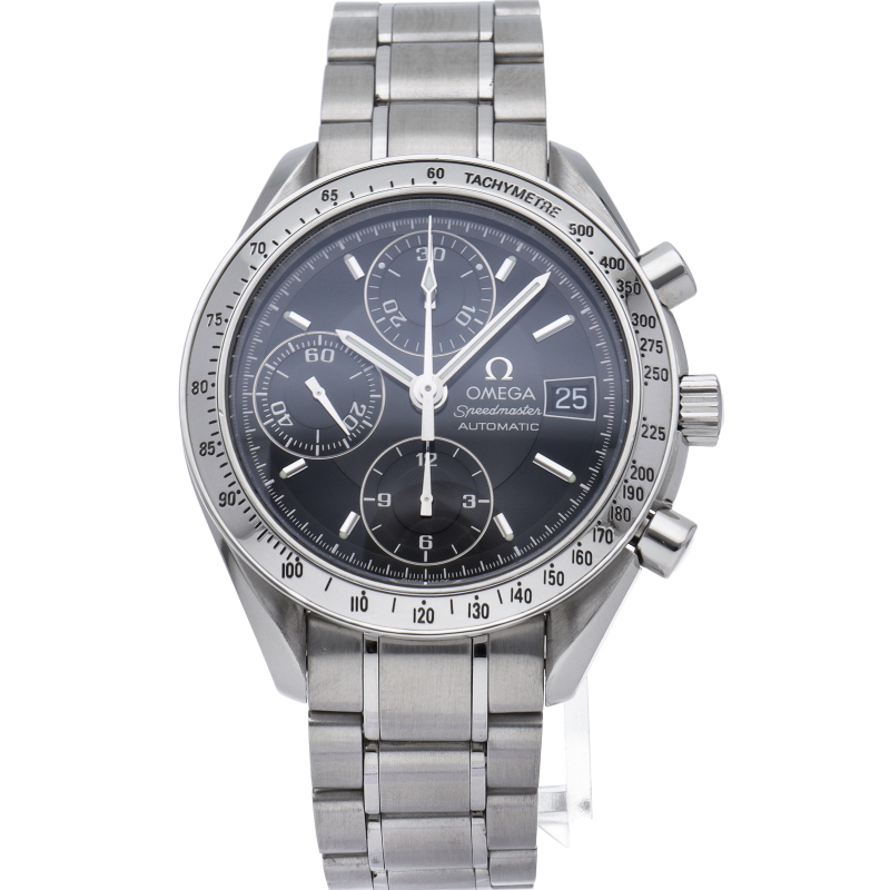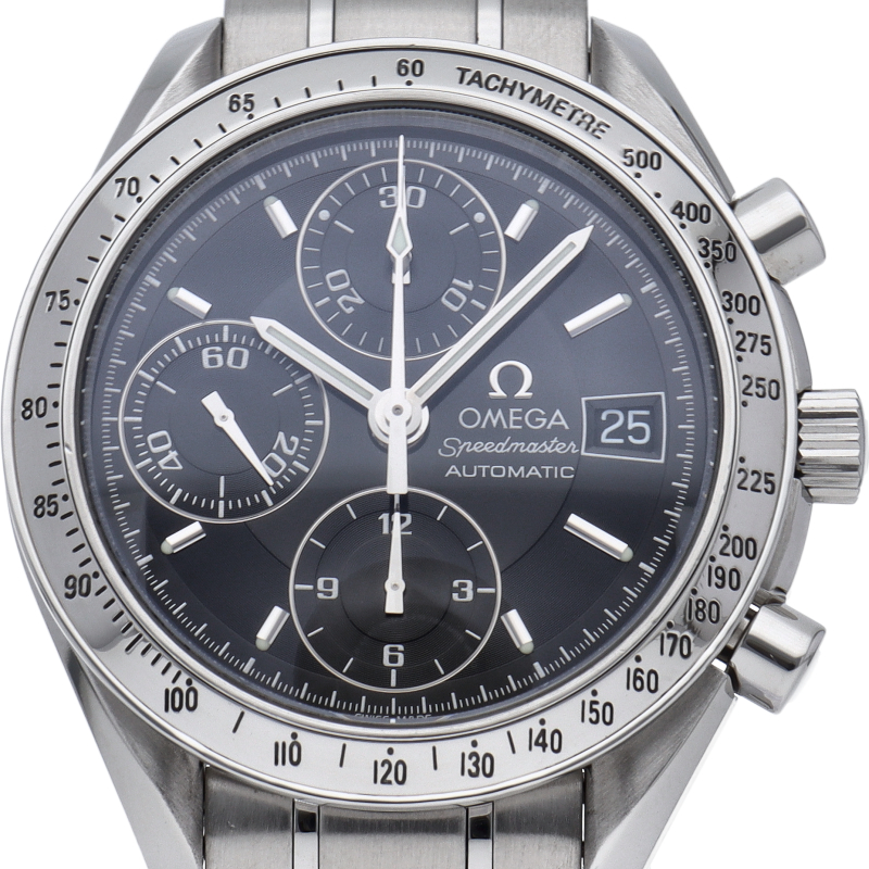 オメガの代表的な人気シリーズ「スピードマスターデイト」。クロノグラフ・デイト表示機能付きと便利で実用性のある1本です。
