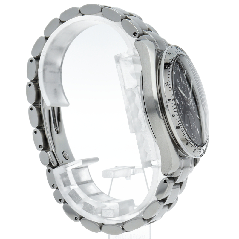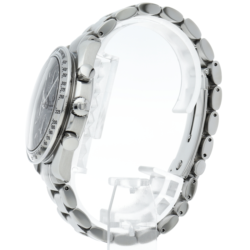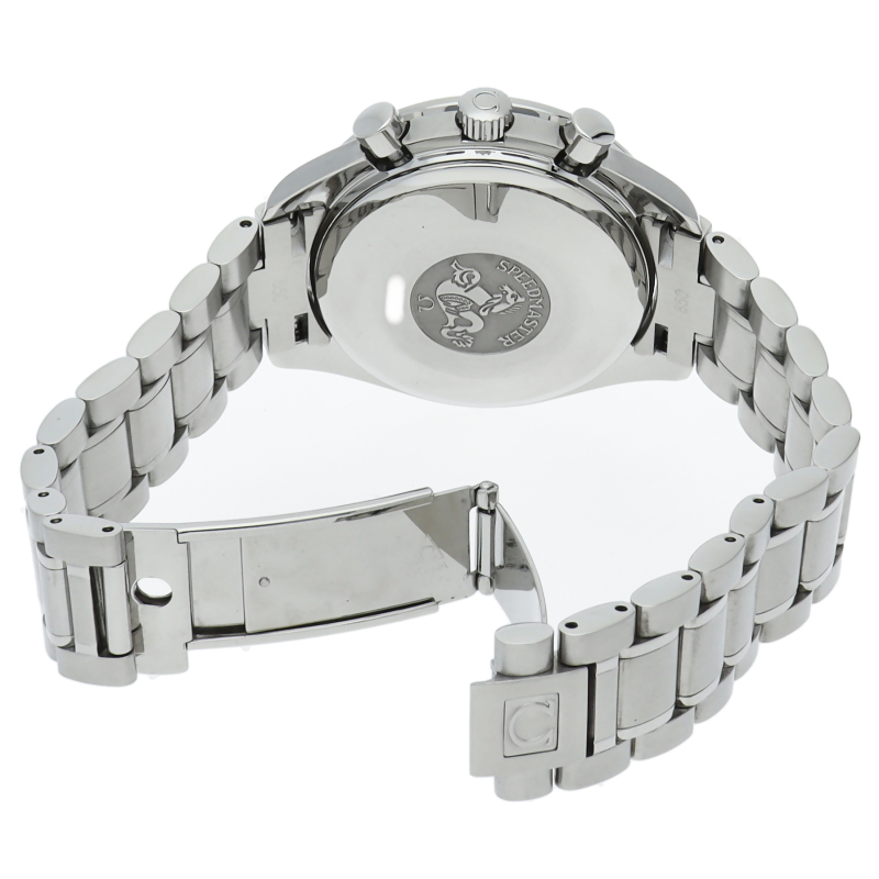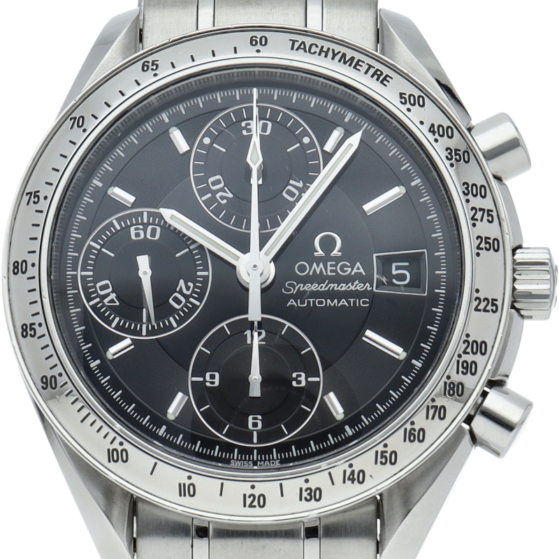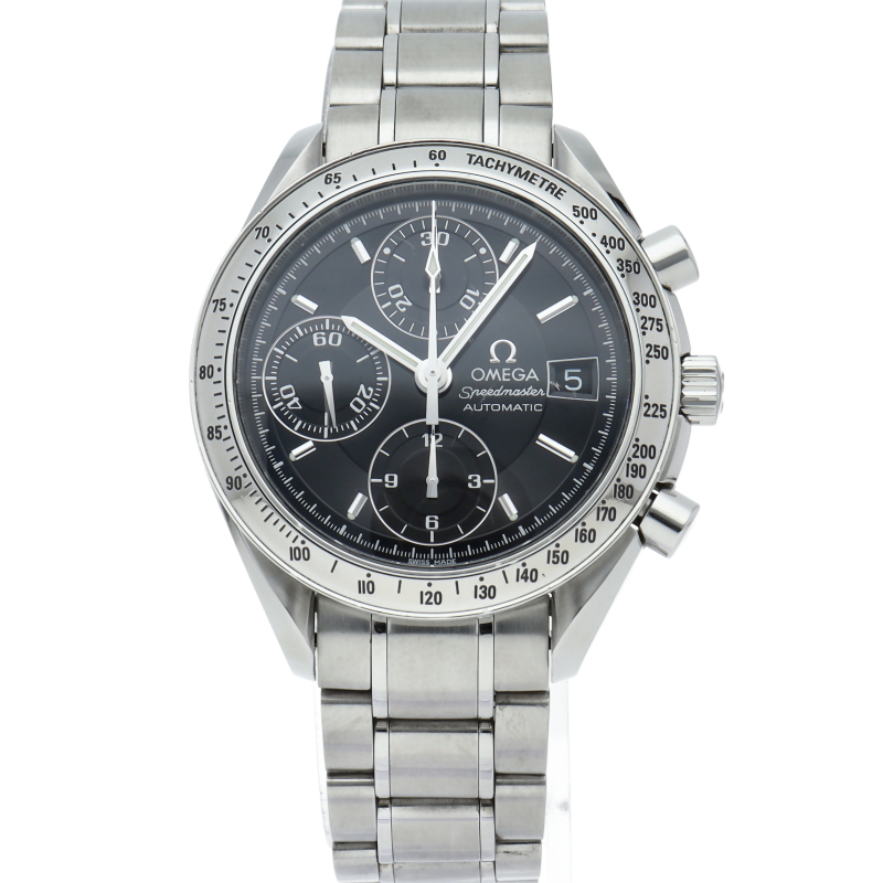 オメガの代表的な人気シリーズ「スピードマスターデイト」。クロノグラフ・デイト表示機能付きと便利で実用性のある1本です。