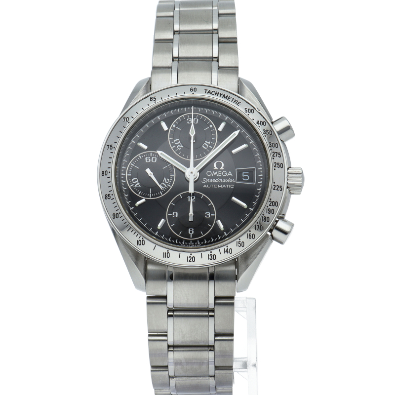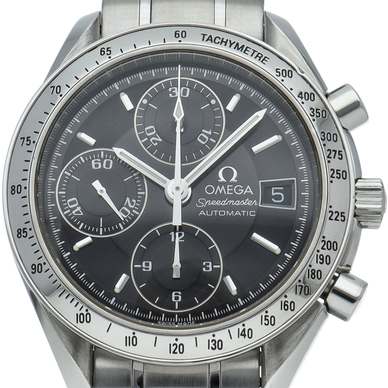 オメガの代表的な人気シリーズ「スピードマスターデイト」。クロノグラフ・デイト表示機能付きと便利で実用性のある1本です。