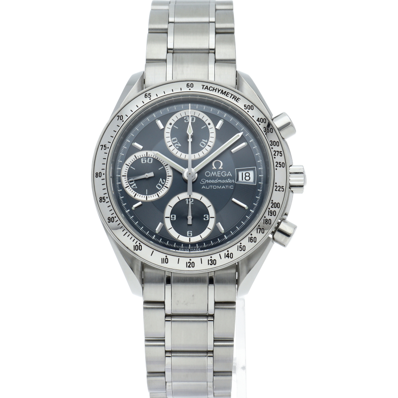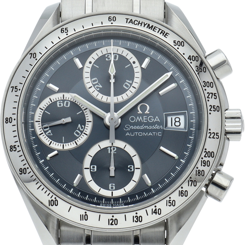 オメガのフラッグシップモデル「スピードマスター」。人気モデル、スピードマスターデイトの「日本国内1000本限定モデル」です。ブルーに近いグレーダイアルと、シルバー縁取りのインダイアルの組み合わせがとてもシック。「日本のオメガファンだけ」に向けられてごく少数リリースされた特別な限定モデルです。
