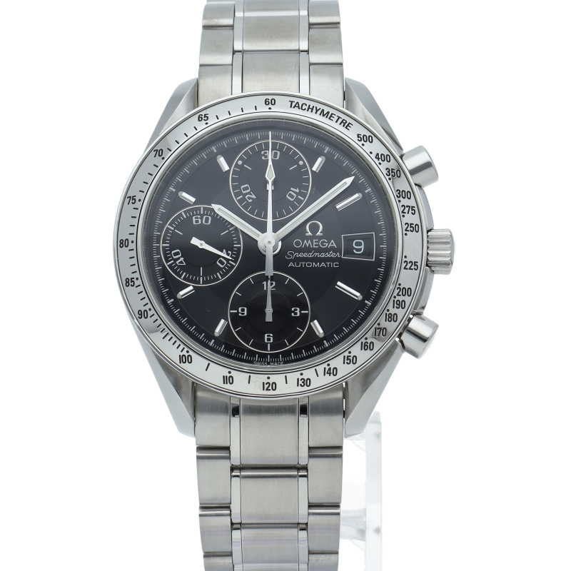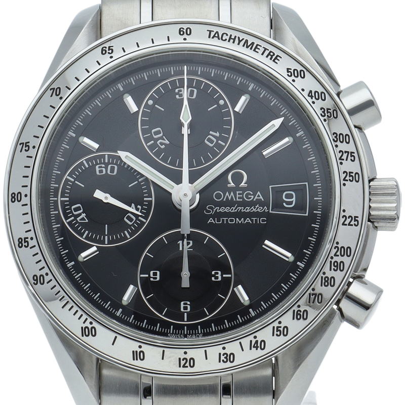 オメガの代表的な人気シリーズ「スピードマスターデイト」。クロノグラフ・デイト表示機能付きと便利で実用性のある1本です。
