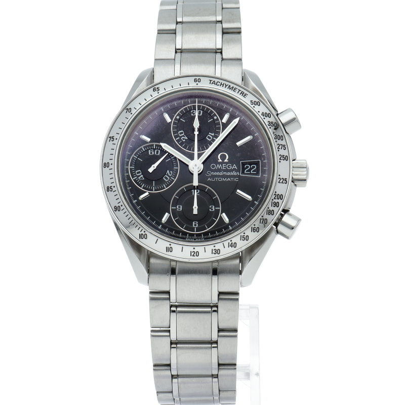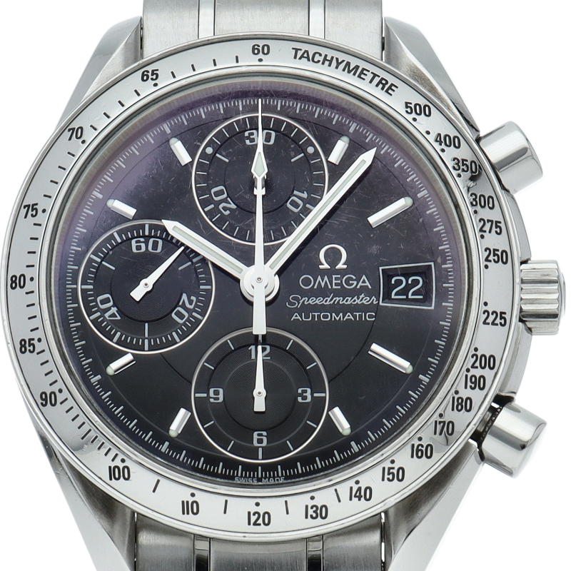 オメガの代表的な人気シリーズ「スピードマスターデイト」。クロノグラフ・デイト表示機能付きと便利で実用性のある1本です。