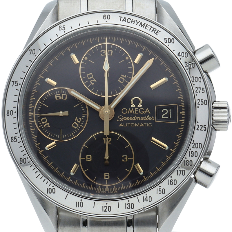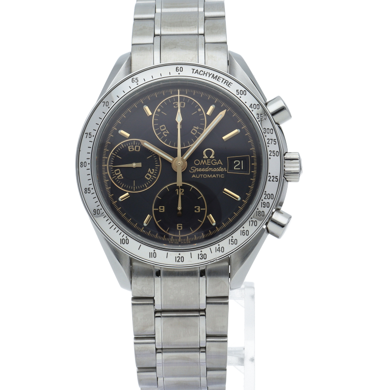 オメガの代表的な人気シリーズ「スピードマスター・デイト」。クロノグラフ・デイト表示機能付きと便利で実用性のある1本です。日本限定のインデックスがゴールドの人気モデルです。