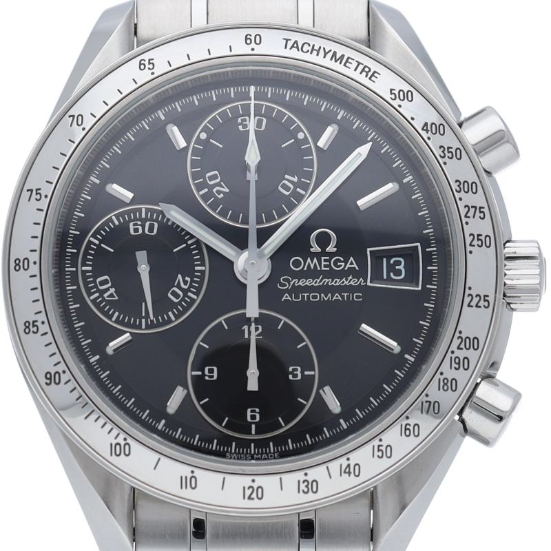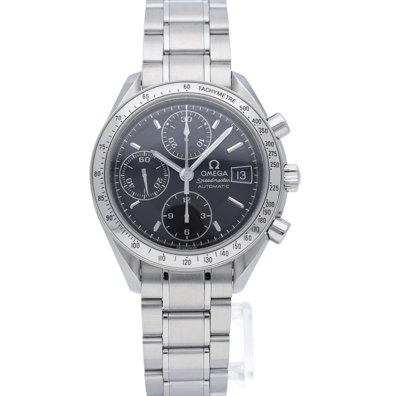 オメガの代表的な人気シリーズ「スピードマスターデイト」。クロノグラフ・デイト表示機能付きと便利で実用性のある1本です。