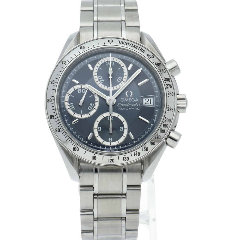 オメガのフラッグシップモデル「スピードマスター」。人気モデル、スピードマスターデイトの「日本国内1000本限定モデル」です。ブルーに近いグレーダイアルと、シルバー縁取りのインダイアルの組み合わせがとてもシック。「日本のオメガファンだけ」に向けられてごく少数リリースされた特別な限定モデルです。