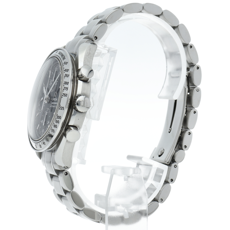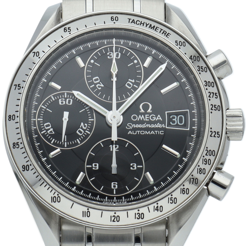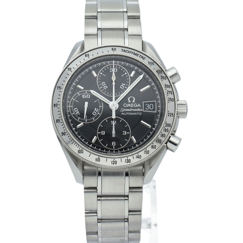 オメガの代表的な人気シリーズ「スピードマスターデイト」。クロノグラフ・デイト表示機能付きと便利で実用性のある1本です。