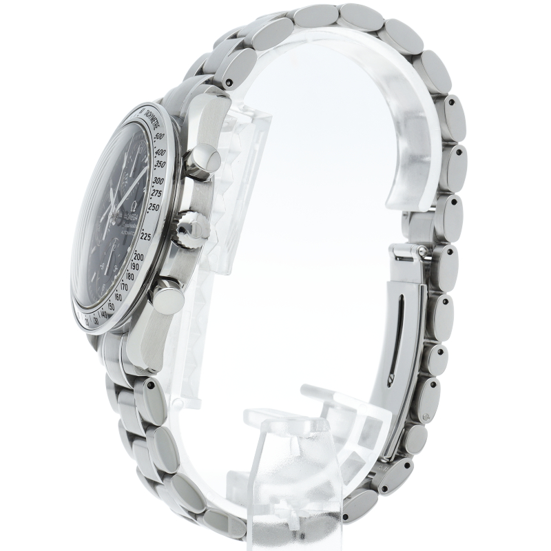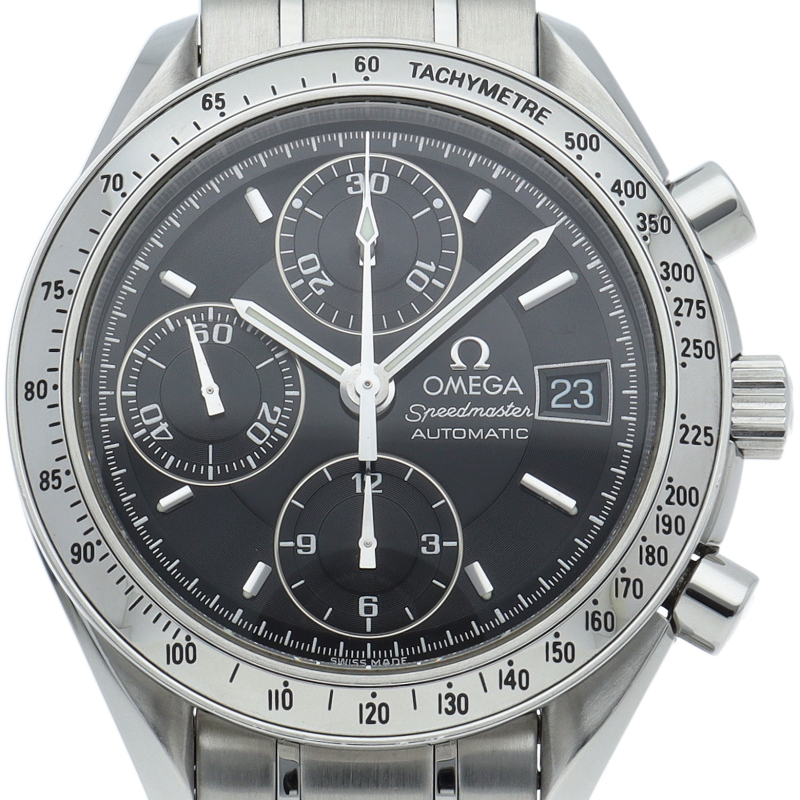 オメガの代表的な人気シリーズ「スピードマスターデイト」。クロノグラフ・デイト表示機能付きと便利で実用性のある1本です。