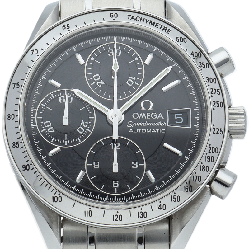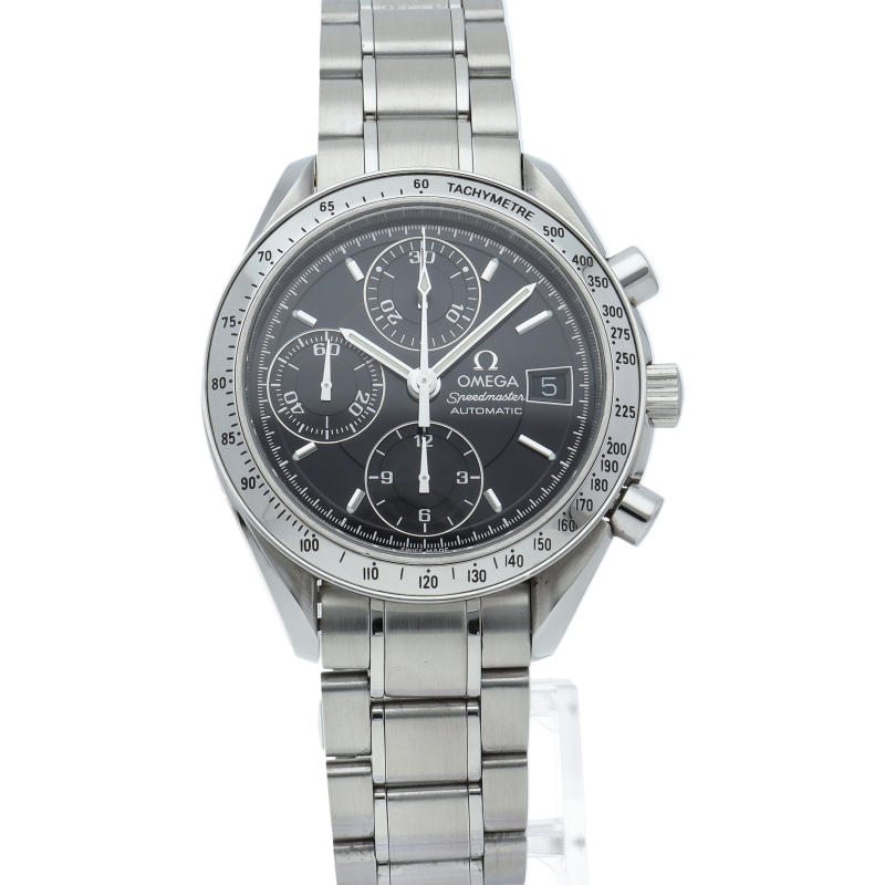 オメガの代表的な人気シリーズ「スピードマスターデイト」。クロノグラフ・デイト表示機能付きと便利で実用性のある1本です。