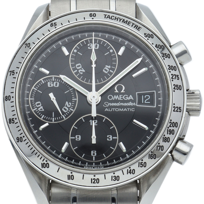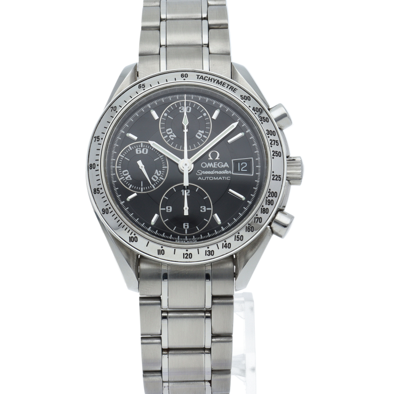 オメガの代表的な人気シリーズ「スピードマスターデイト」。クロノグラフ・デイト表示機能付きと便利で実用性のある1本です。