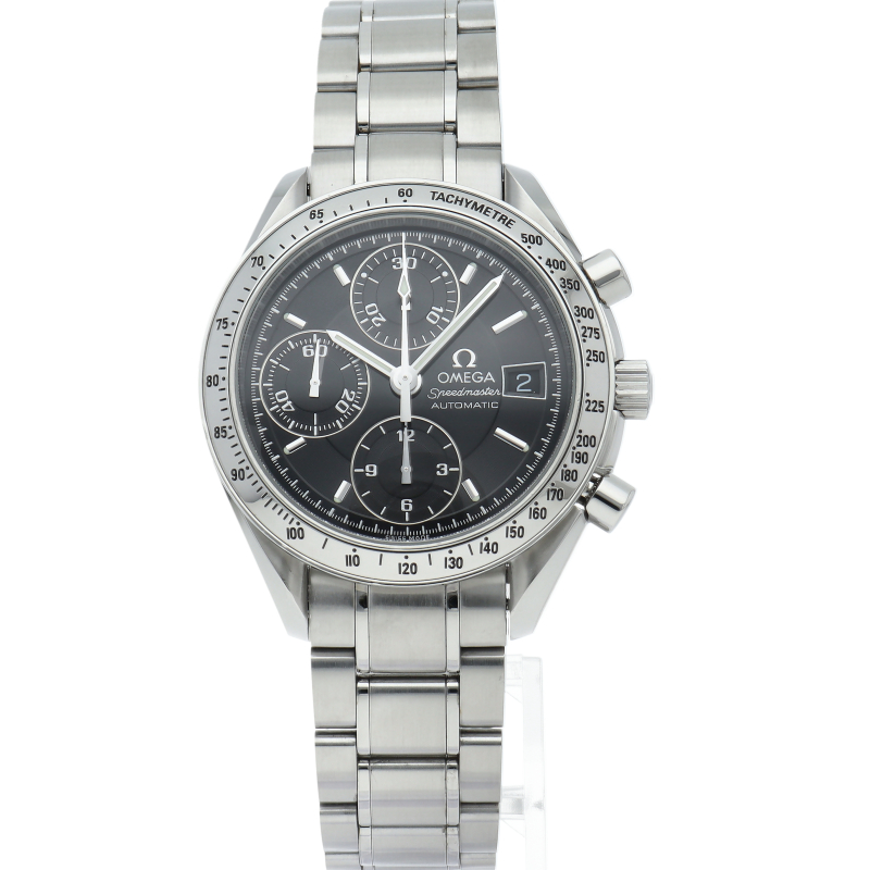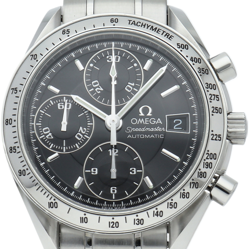 オメガの代表的な人気シリーズ「スピードマスターデイト」。クロノグラフ・デイト表示機能付きと便利で実用性のある1本です。