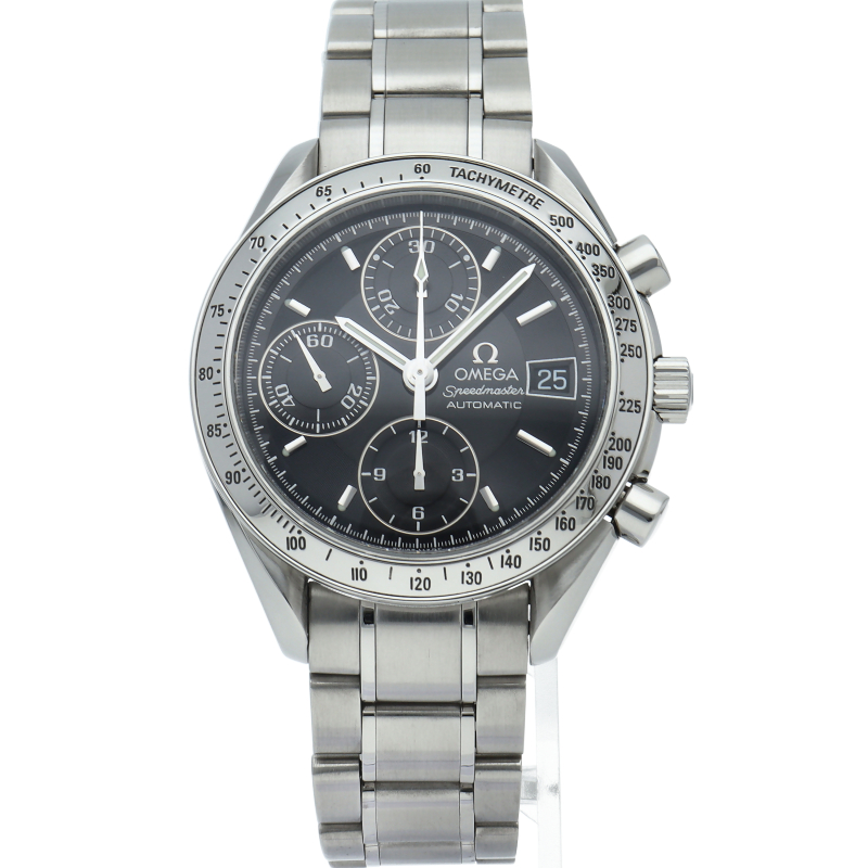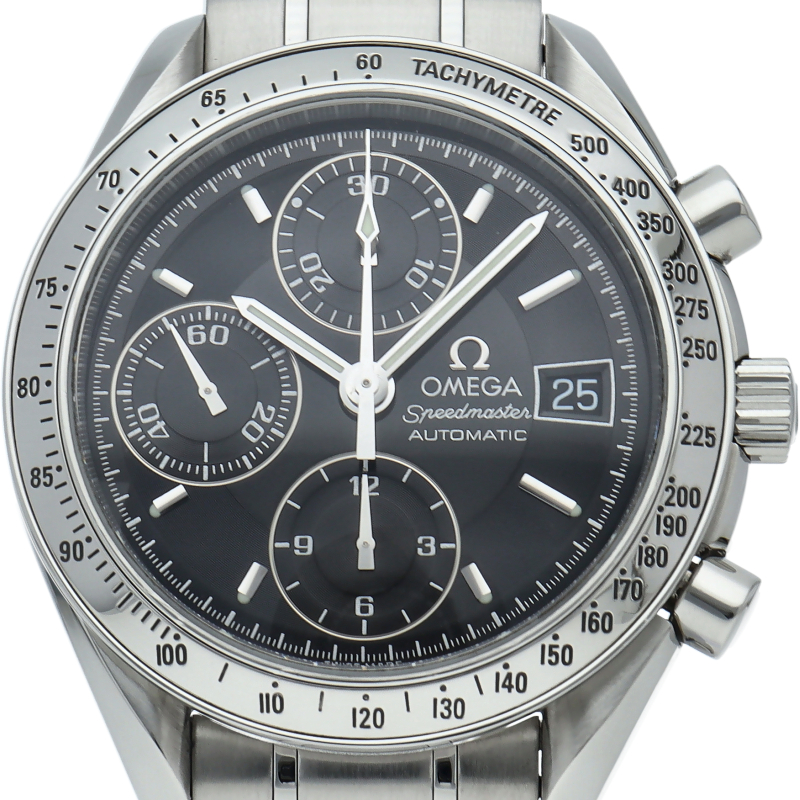 オメガの代表的な人気シリーズ「スピードマスターデイト」。クロノグラフ・デイト表示機能付きと便利で実用性のある1本です。
