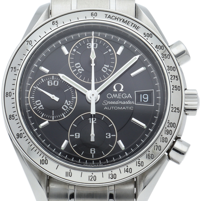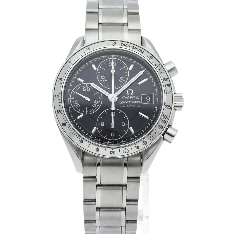 オメガの代表的な人気シリーズ「スピードマスターデイト」。クロノグラフ・デイト表示機能付きと便利で実用性のある1本です。