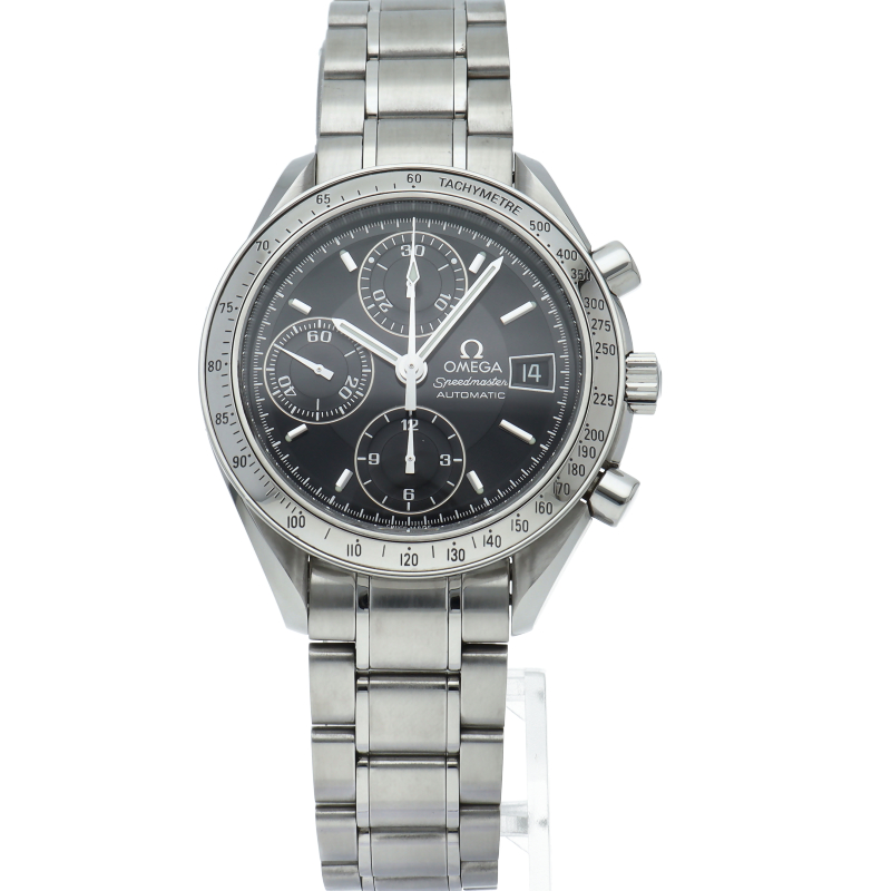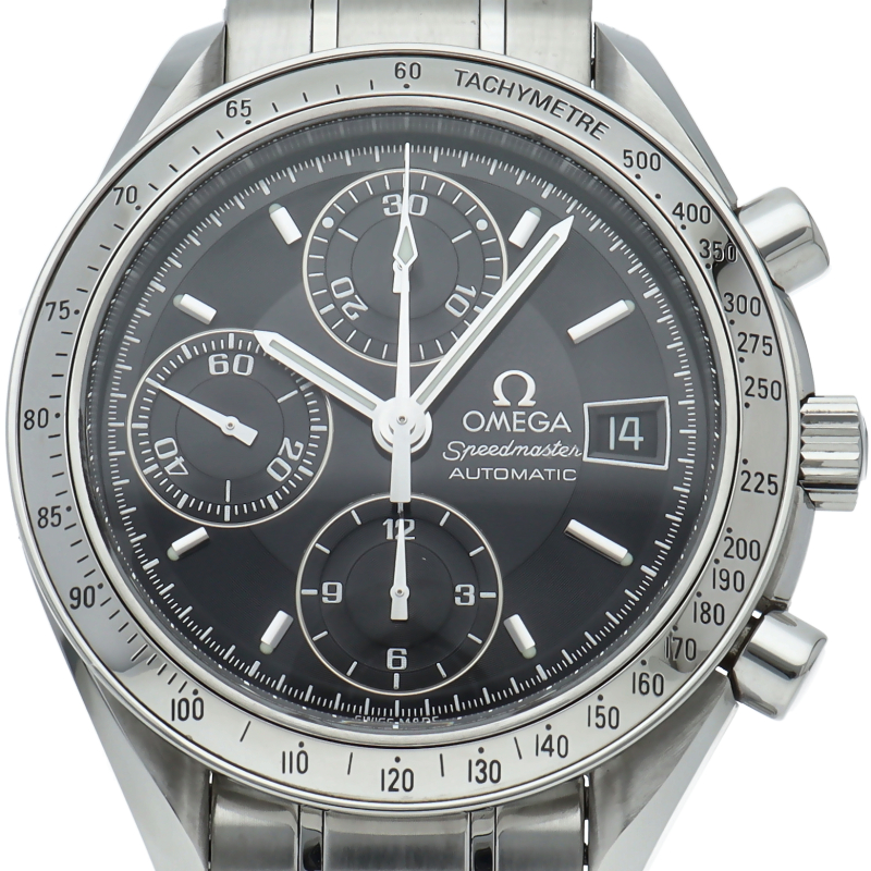 オメガの代表的な人気シリーズ「スピードマスターデイト」。クロノグラフ・デイト表示機能付きと便利で実用性のある1本です。