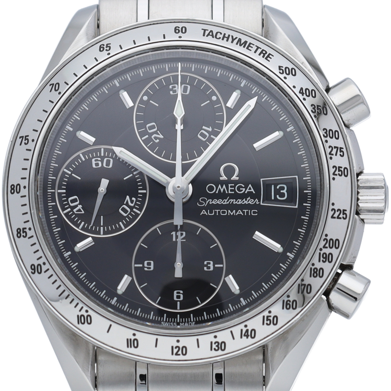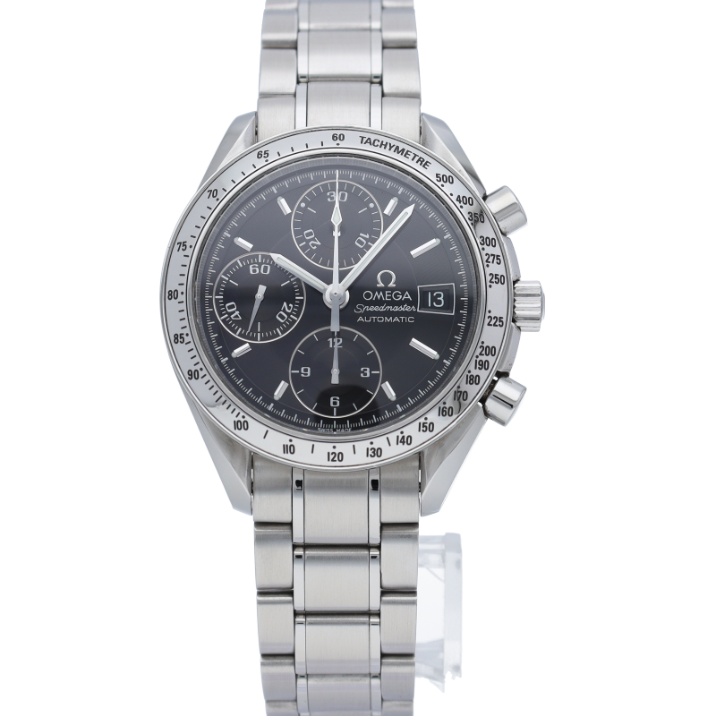 オメガの代表的な人気シリーズ「スピードマスターデイト」。クロノグラフ・デイト表示機能付きと便利で実用性のある1本です。