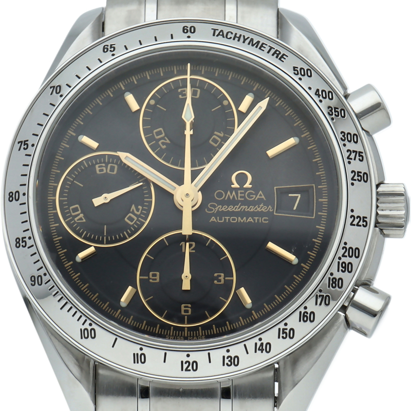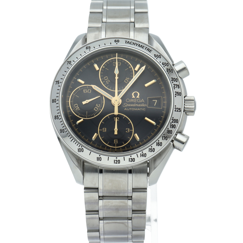 オメガの代表的な人気シリーズ「スピードマスター・デイト」。クロノグラフ・デイト表示機能付きと便利で実用性のある1本です。日本限定のインデックスがゴールドの人気モデルです。