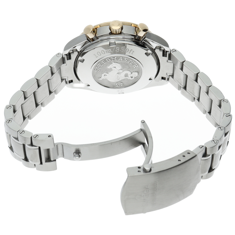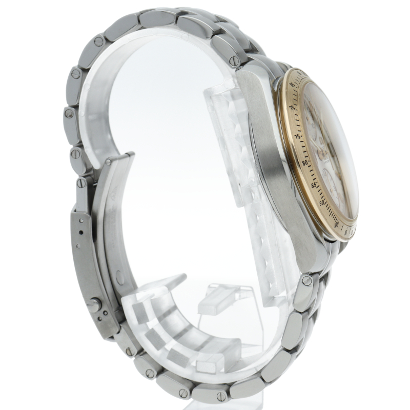 機械式クロノグラフの定番品「スピードマスター」のコンビモデル。40mmケースにサイズアップし、防水性も100mに強化された新しいオートマチックモデルです。ムーブメントはクロノメーター検定をパスしたCal.1164を搭載。各部の作りのクオリティーも進化し、高級感が一層増しています。
