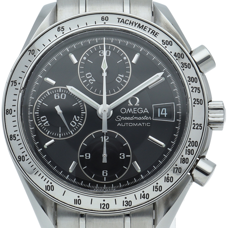オメガの代表的な人気シリーズ「スピードマスターデイト」。クロノグラフ・デイト表示機能付きと便利で実用性のある1本です。