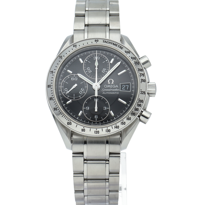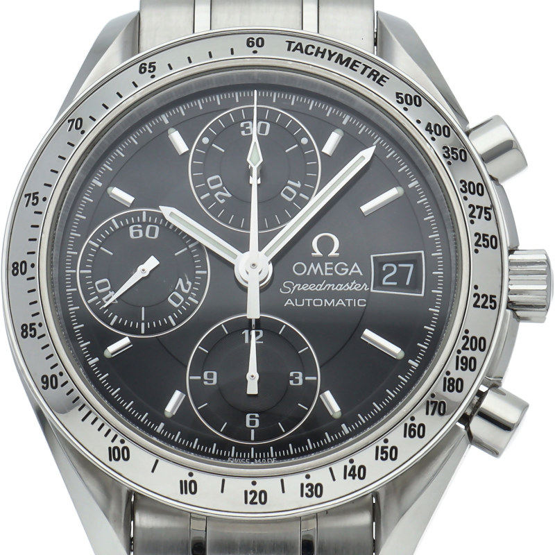 オメガの代表的な人気シリーズ「スピードマスターデイト」。クロノグラフ・デイト表示機能付きと便利で実用性のある1本です。