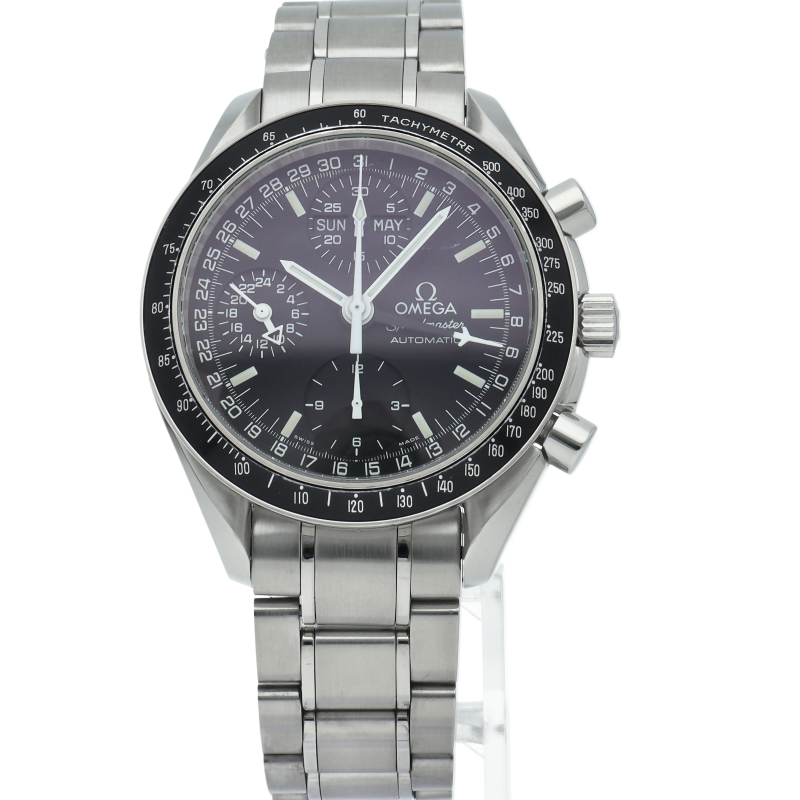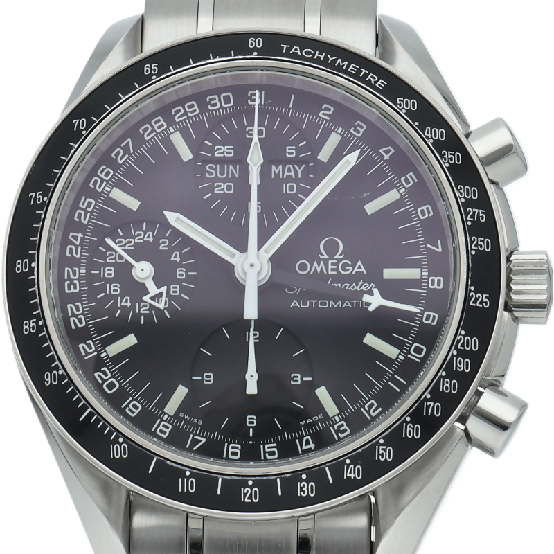 オメガの人気「スピードマスター」。クロノグラフ、月・日・曜日表示機能がついた便利な多機能ウォッチ。スタイルを選ばずにご使用いただける便利な1本。