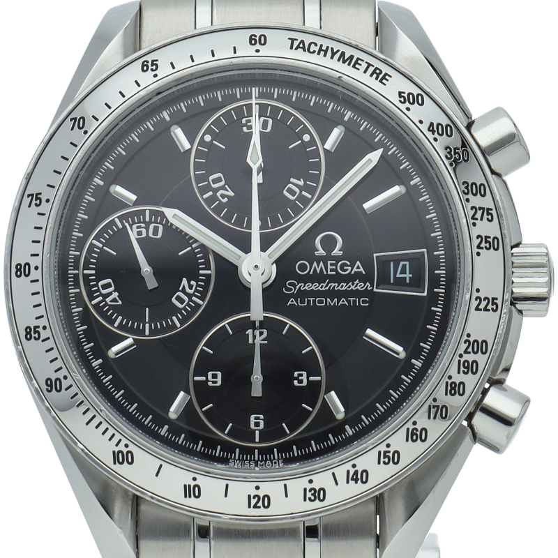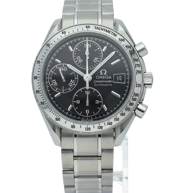 オメガの代表的な人気シリーズ「スピードマスターデイト」。クロノグラフ・デイト表示機能付きと便利で実用性のある1本です。