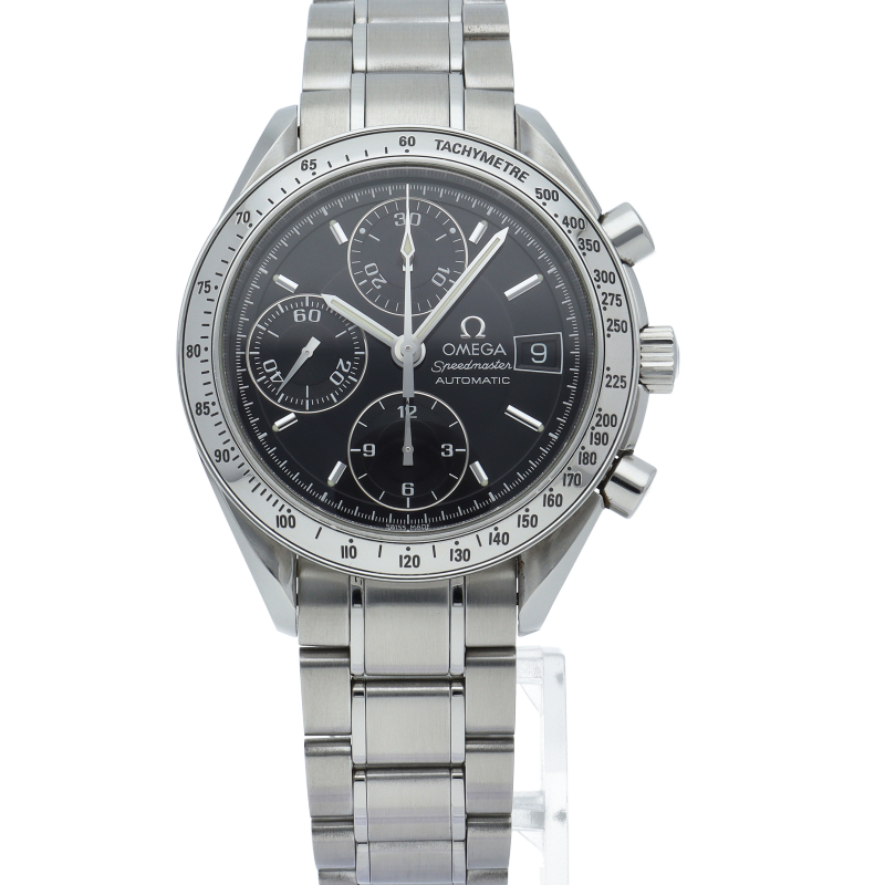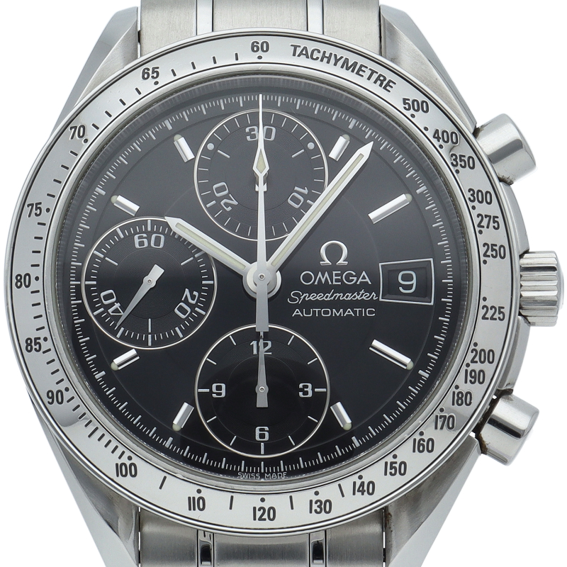 オメガの代表的な人気シリーズ「スピードマスターデイト」。クロノグラフ・デイト表示機能付きと便利で実用性のある1本です。