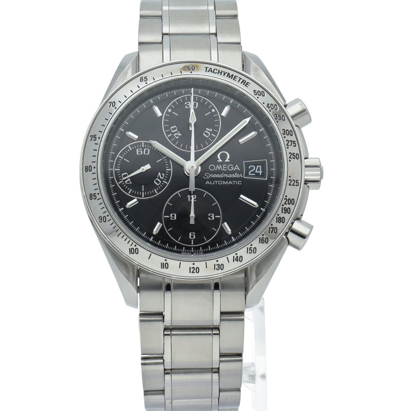 オメガの代表的な人気シリーズ「スピードマスターデイト」。クロノグラフ・デイト表示機能付きと便利で実用性のある1本です。