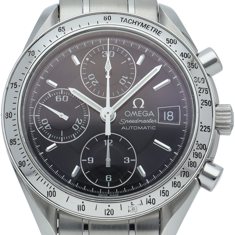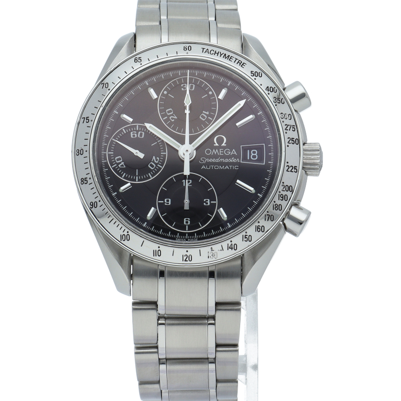 オメガの代表的な人気シリーズ「スピードマスターデイト」。クロノグラフ・デイト表示機能付きと便利で実用性のある1本です。