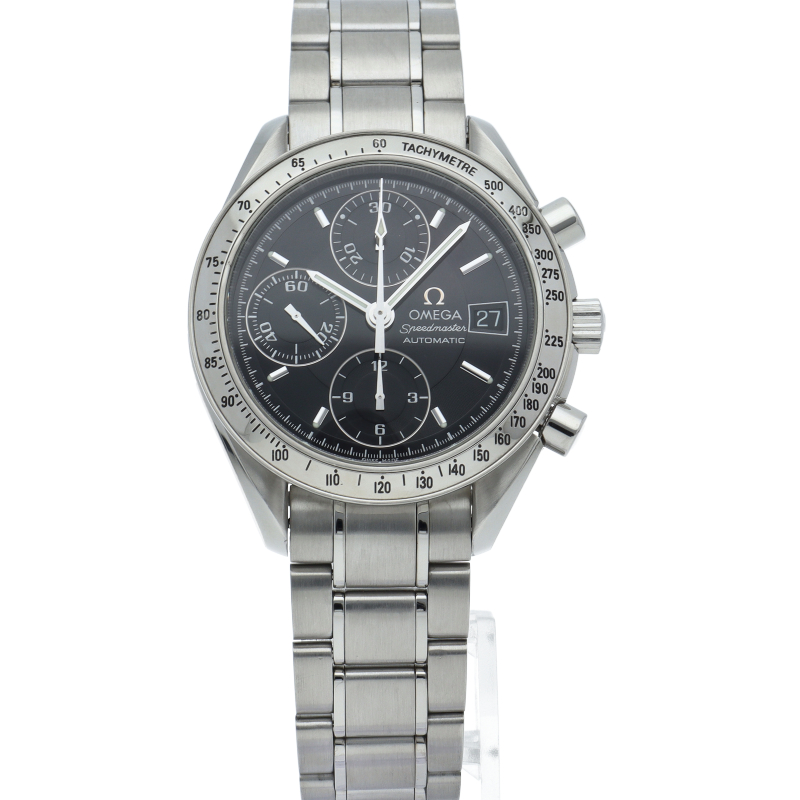 オメガの代表的な人気シリーズ「スピードマスターデイト」。クロノグラフ・デイト表示機能付きと便利で実用性のある1本です。