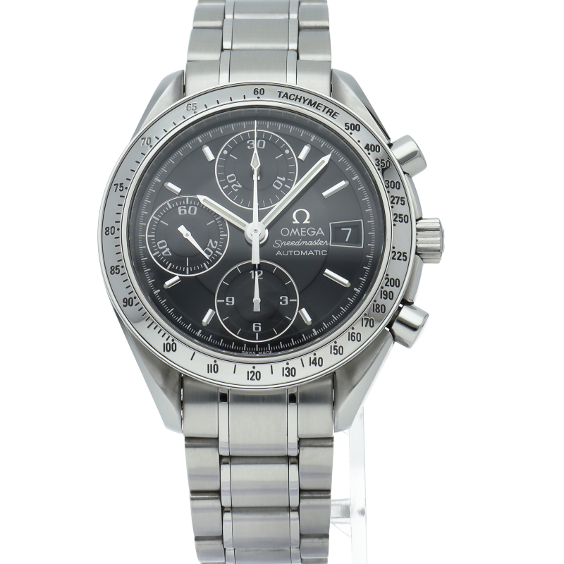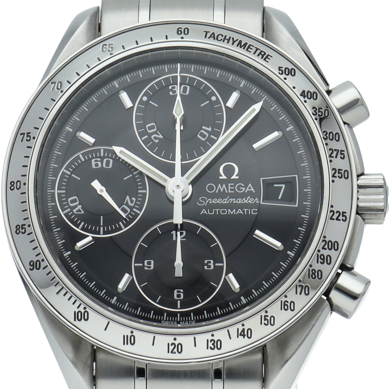 オメガの代表的な人気シリーズ「スピードマスターデイト」。クロノグラフ・デイト表示機能付きと便利で実用性のある1本です。