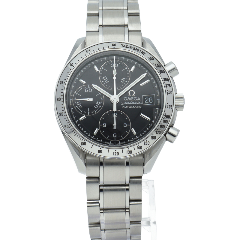 オメガの代表的な人気シリーズ「スピードマスターデイト」。クロノグラフ・デイト表示機能付きと便利で実用性のある1本です。