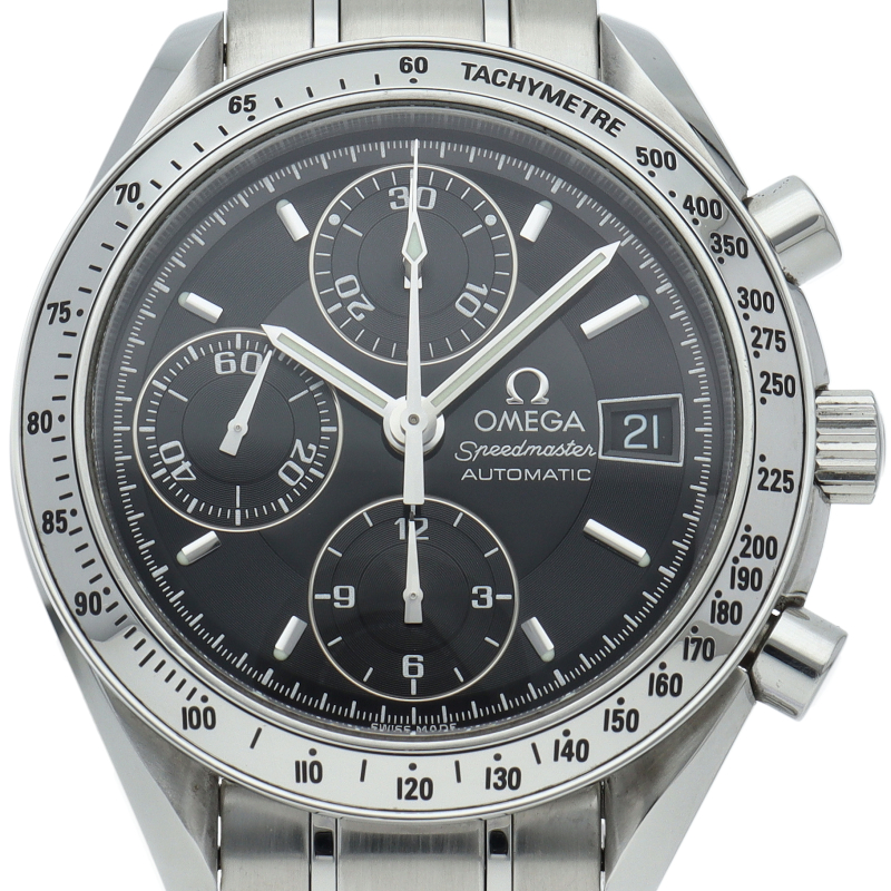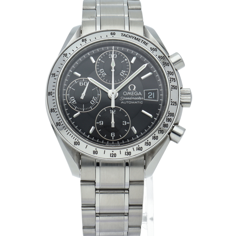 オメガの代表的な人気シリーズ「スピードマスターデイト」。クロノグラフ・デイト表示機能付きと便利で実用性のある1本です。