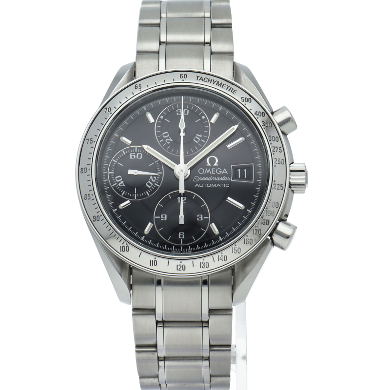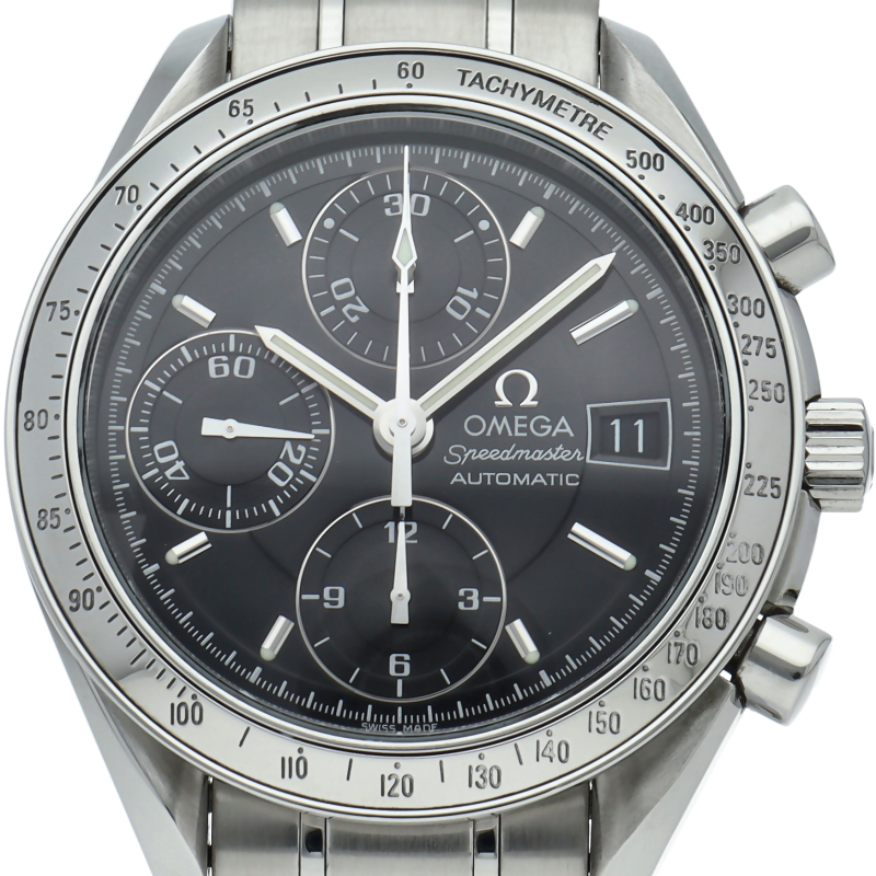 オメガの代表的な人気シリーズ「スピードマスターデイト」。クロノグラフ・デイト表示機能付きと便利で実用性のある1本です。