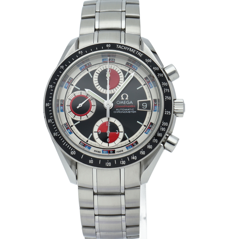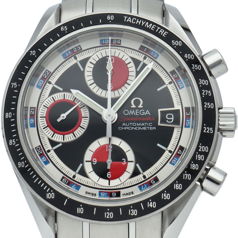 オメガの代表的な人気シリーズ「スピードマスター デイト」。クロノグラフ・デイト表示機能付きと便利で実用性のある1本です。カラフルな文字盤色が、まわりと少し差を付けたい方にうってつけの1本です。