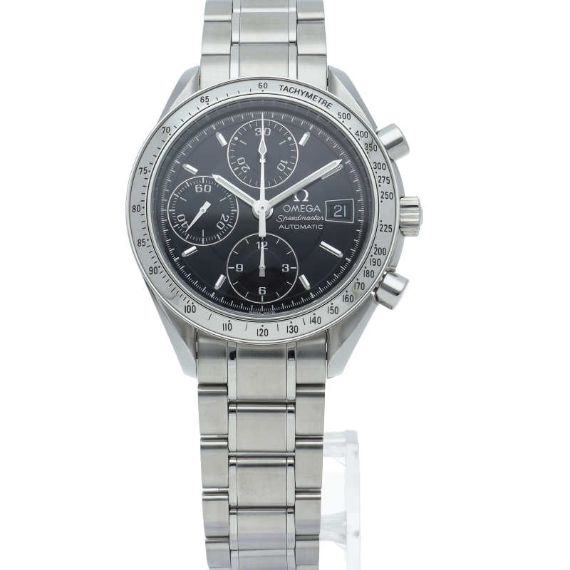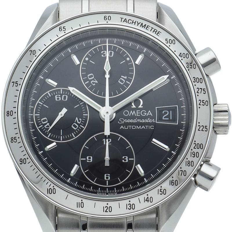 オメガの代表的な人気シリーズ「スピードマスターデイト」。クロノグラフ・デイト表示機能付きと便利で実用性のある1本です。