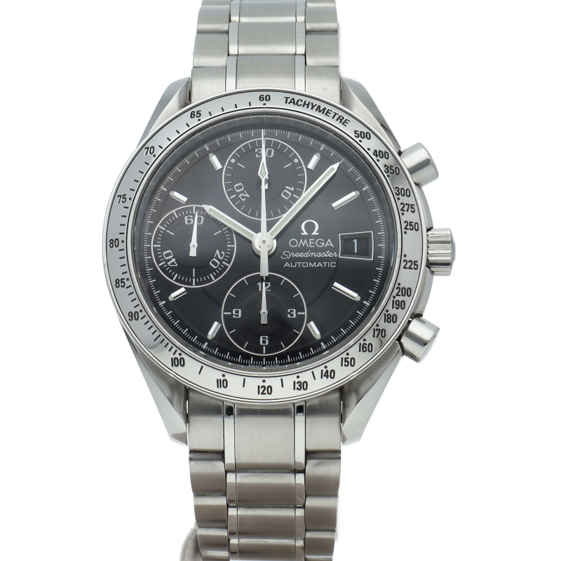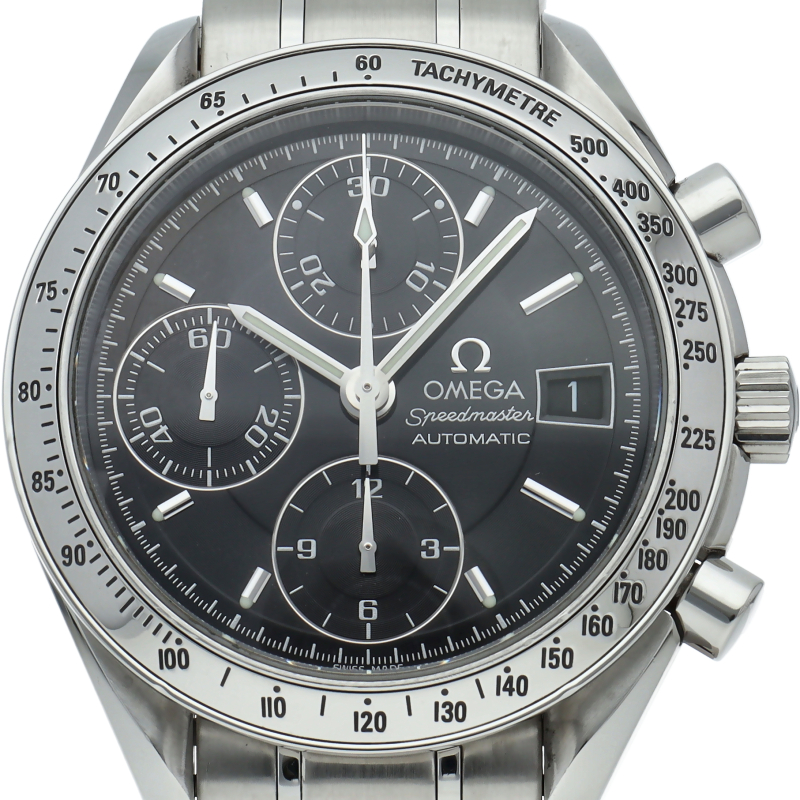 オメガの代表的な人気シリーズ「スピードマスターデイト」。クロノグラフ・デイト表示機能付きと便利で実用性のある1本です。