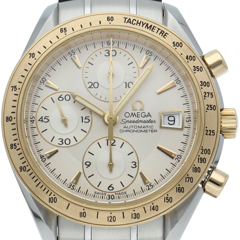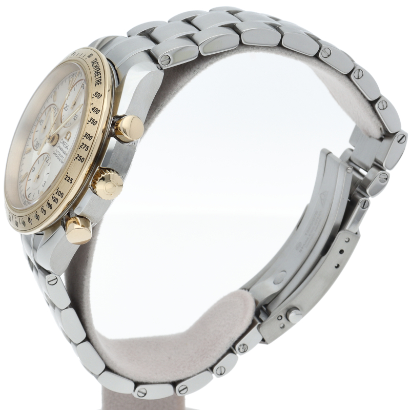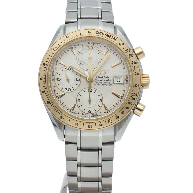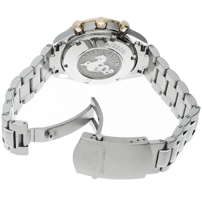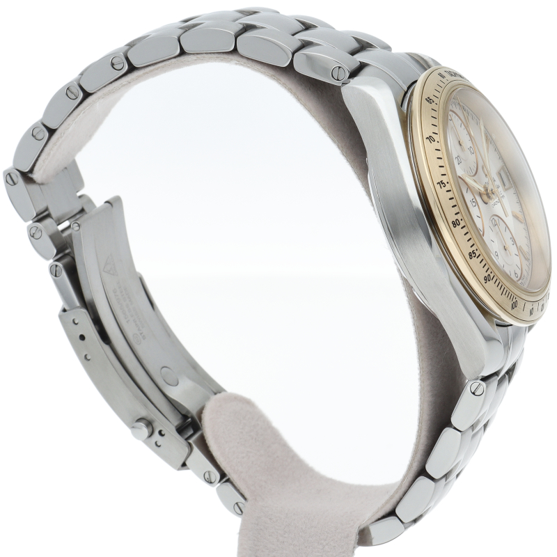 機械式クロノグラフの定番品「スピードマスター」のコンビモデル。40mmケースにサイズアップし、防水性も100mに強化された新しいオートマチックモデルです。ムーブメントはクロノメーター検定をパスしたCal.1164を搭載。各部の作りのクオリティーも進化し、高級感が一層増しています。