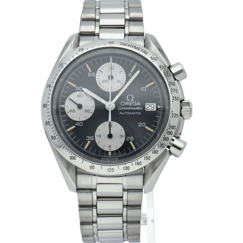 オメガの代表的な人気シリーズ「スピードマスターデイト」。クロノグラフ・デイト表示機能付きと便利で実用性のある1本です。