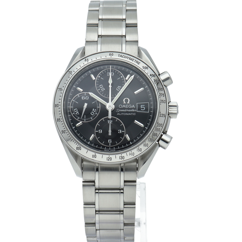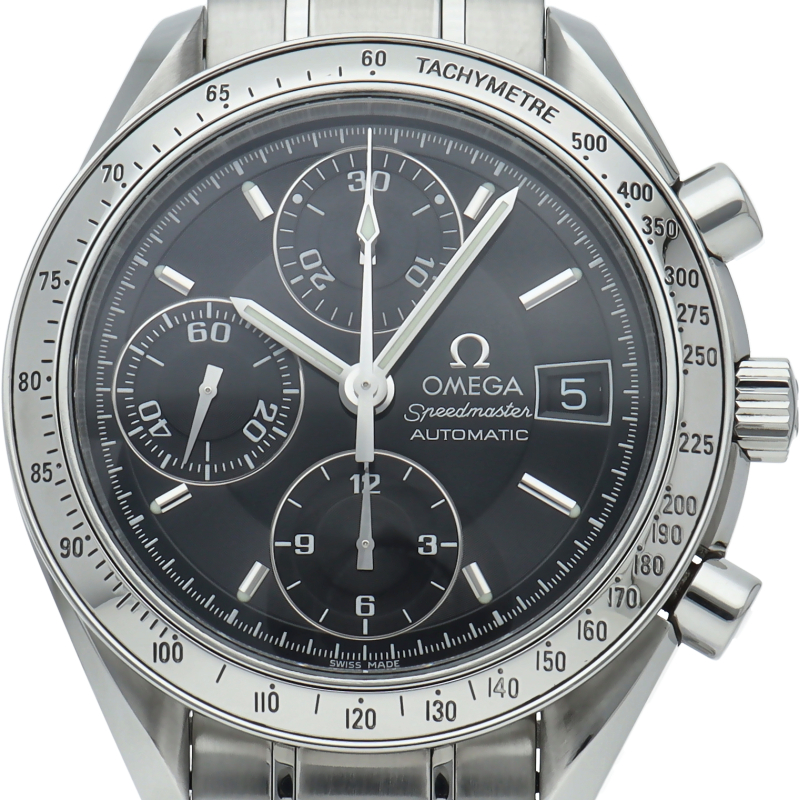 オメガの代表的な人気シリーズ「スピードマスターデイト」。クロノグラフ・デイト表示機能付きと便利で実用性のある1本です。