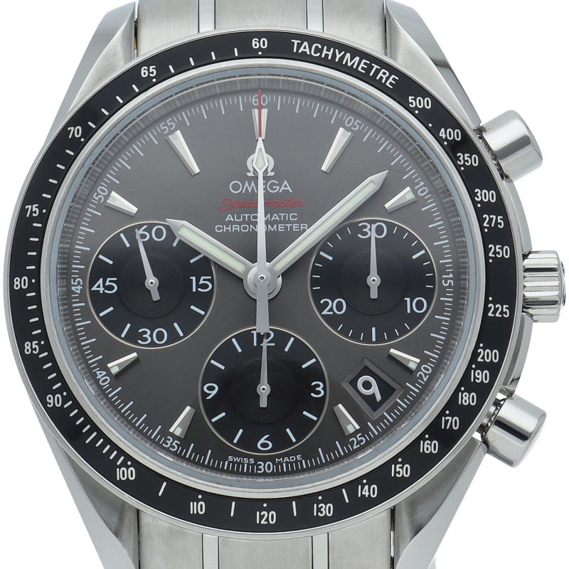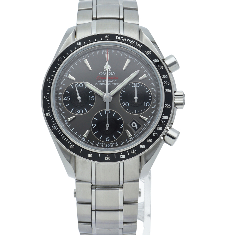 オメガの人気シリーズ「スピードマスター デイト」のクロノメーター規格をパスしたモデル。実用性とデザイン性を兼ね備えた人気の1本。