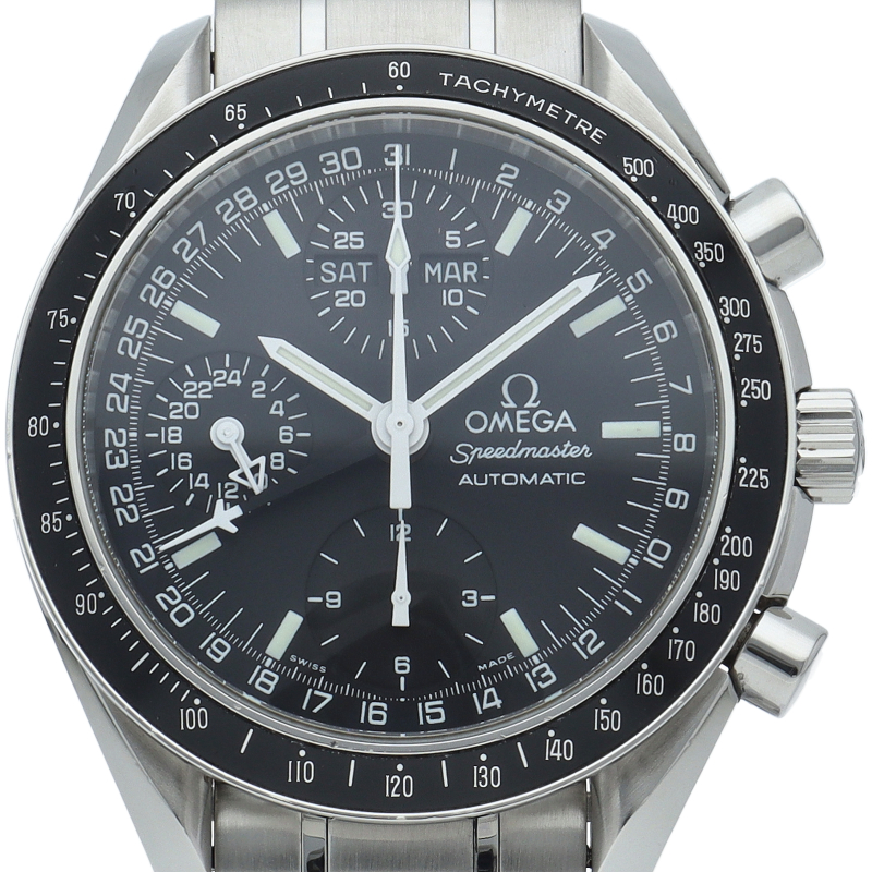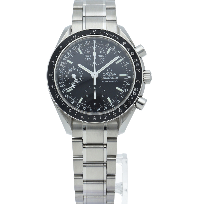 オメガの人気「スピードマスター」。クロノグラフ、月・日・曜日表示機能がついた便利な多機能ウォッチ。スタイルを選ばずにご使用いただける便利な1本。