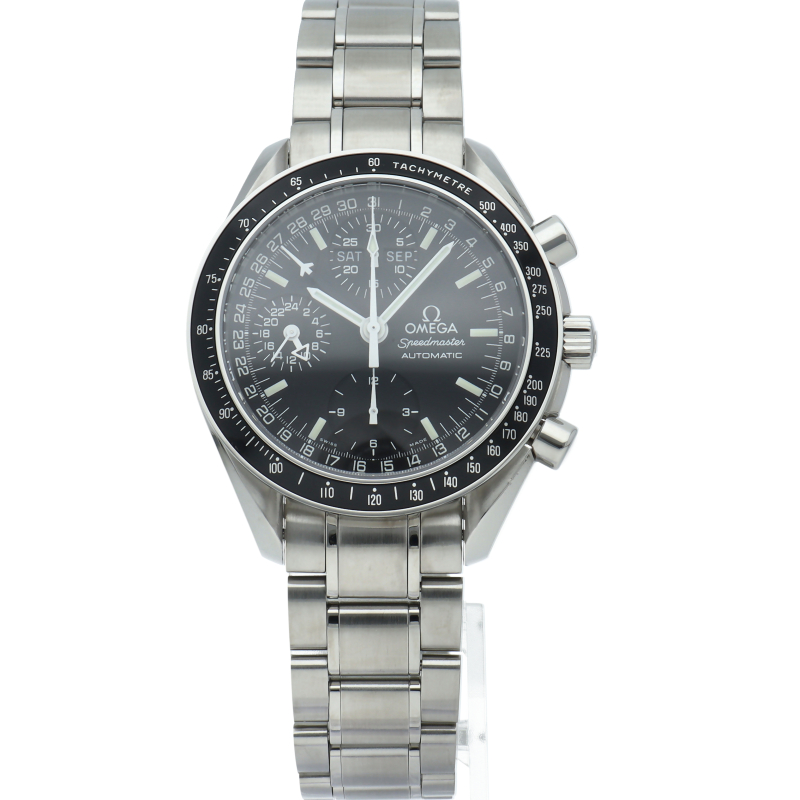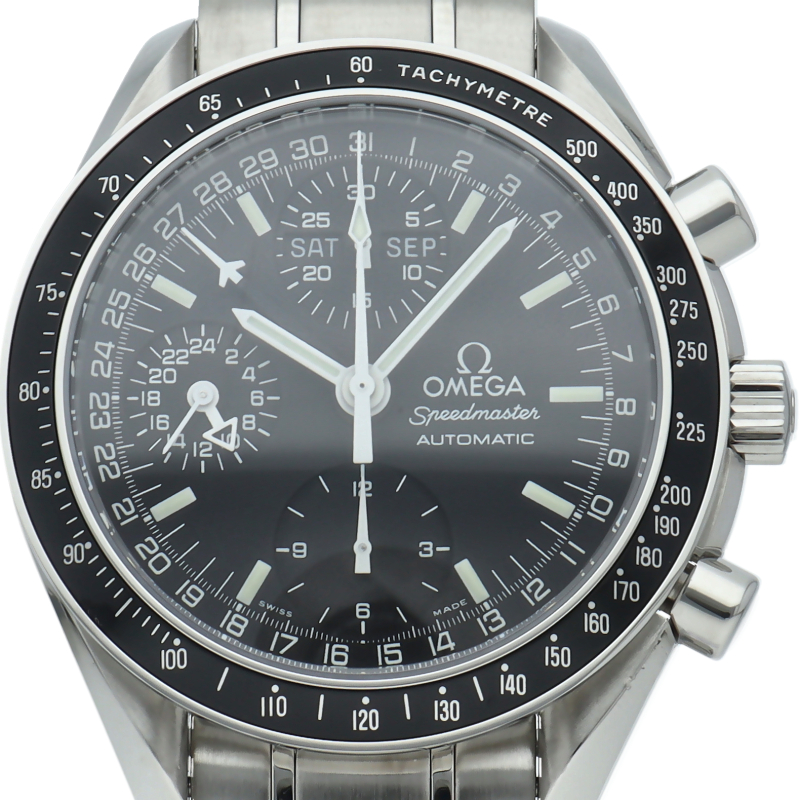 オメガの人気「スピードマスター」。クロノグラフ、月・日・曜日表示機能がついた便利な多機能ウォッチ。スタイルを選ばずにご使用いただける便利な1本。